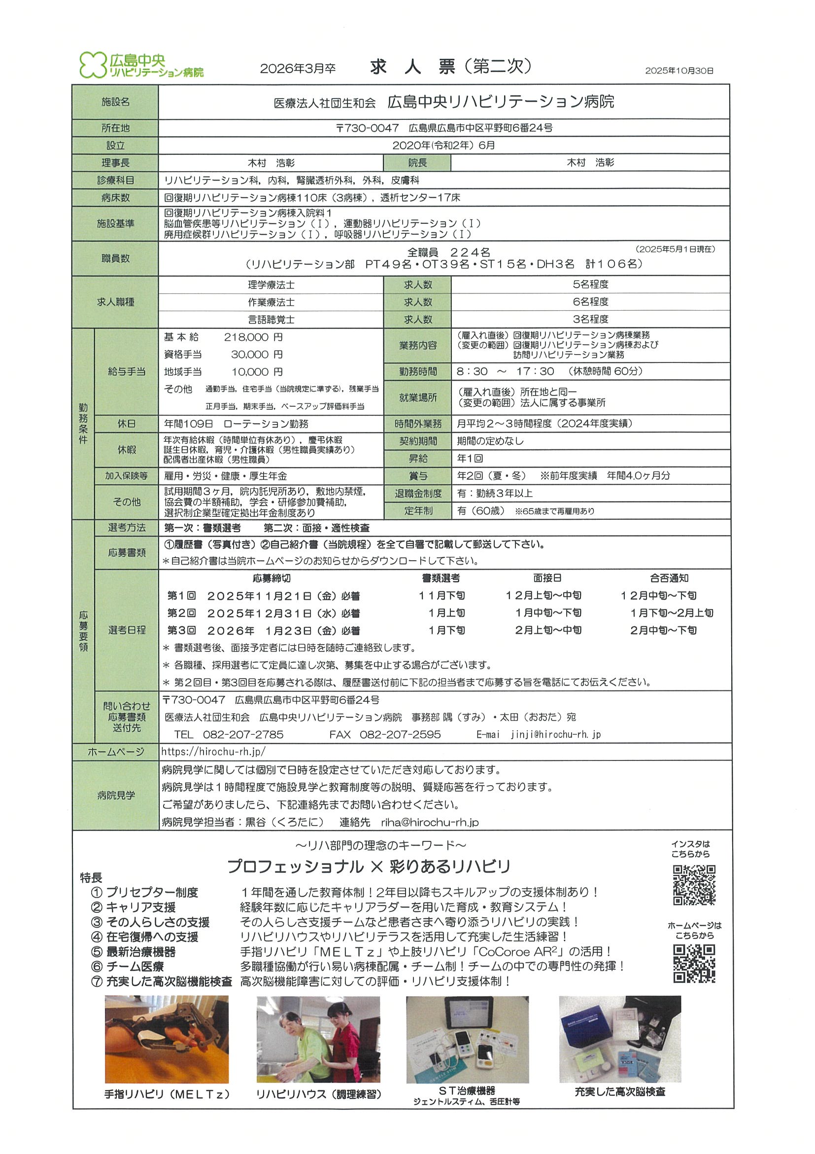 リハビリテーション部 2025年度新卒募集のお知らせ 第二次募集(第1回11月21日締め切り)